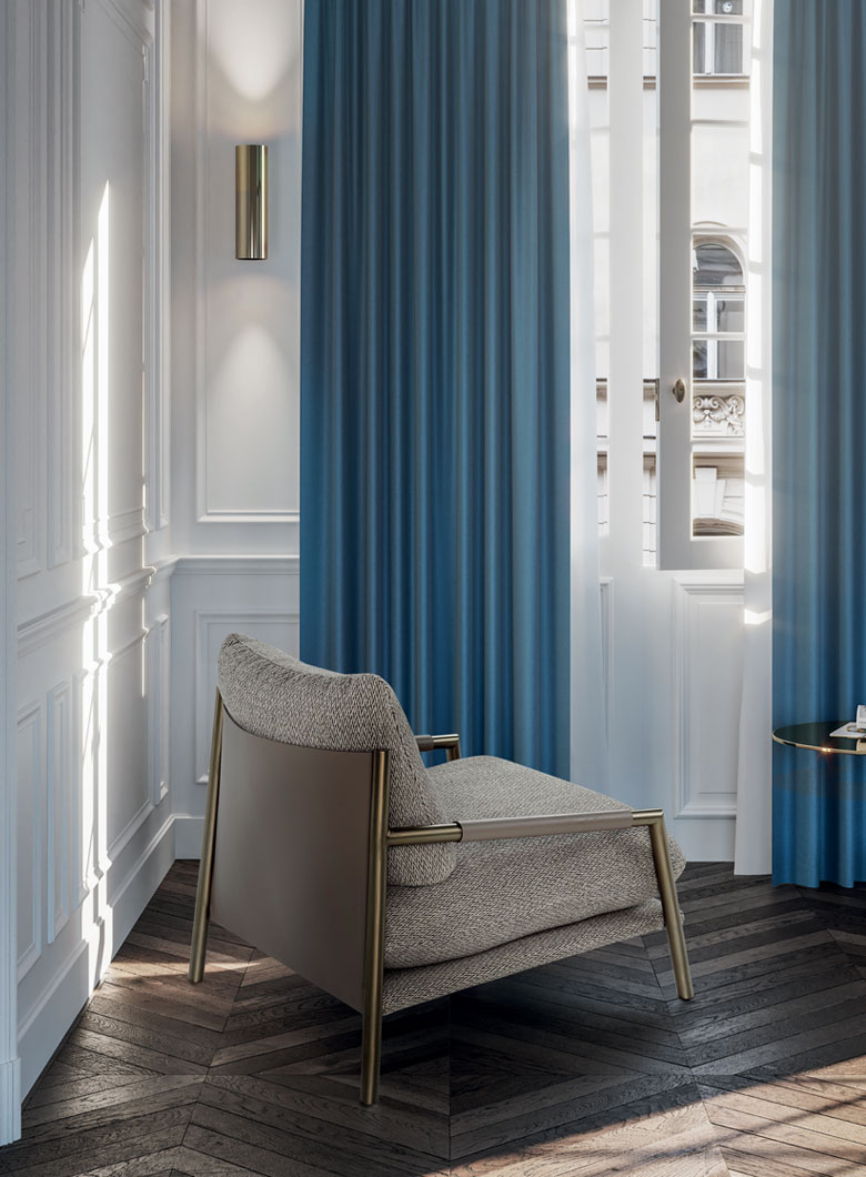 Light in shape and surprisingly comfortable, Norman is an armchair characterised by a tubular metal frame that tilts forward, as if to challenge those who admire it, and invites them to sit down and experience its unexpected comfort. Equipped with a shell and armrests upholstered in regenerated leather, Norman welcomes a soft cushion-back designed to offer a stylish yet informal comfort experience.