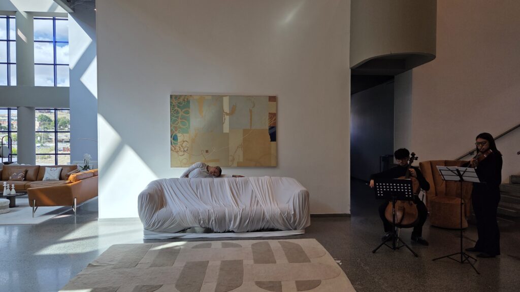 A particularly moving moment was the dance-theatre performance by the students of IIS « Turi-Morra » in Matera, accompanied by the musical duo Federica Angela Pirretti (violin) and Pasquale Lovecchio (cello). The performance paid tribute to choreographer Reinhild Hoffmann with a reinterpretation of her iconic Solo mit Sofà — the solo with the sofa. A poetic and powerful way to reflect on the connection between body, objects, and memory, and to express the spirit of Calia Italia: a company that continues to evolve while staying true to its roots.