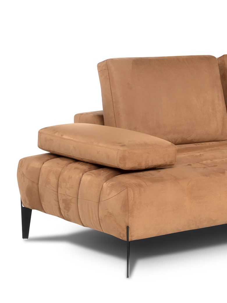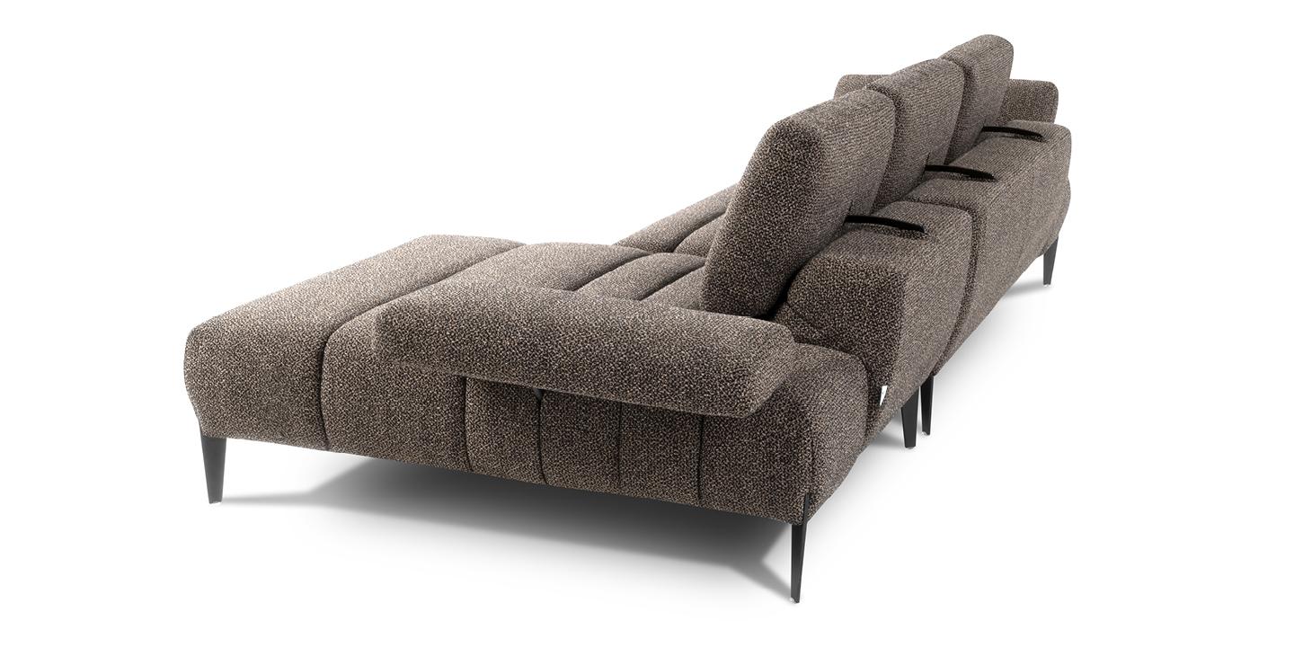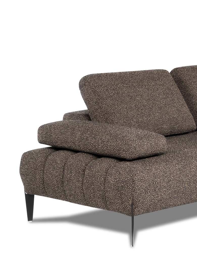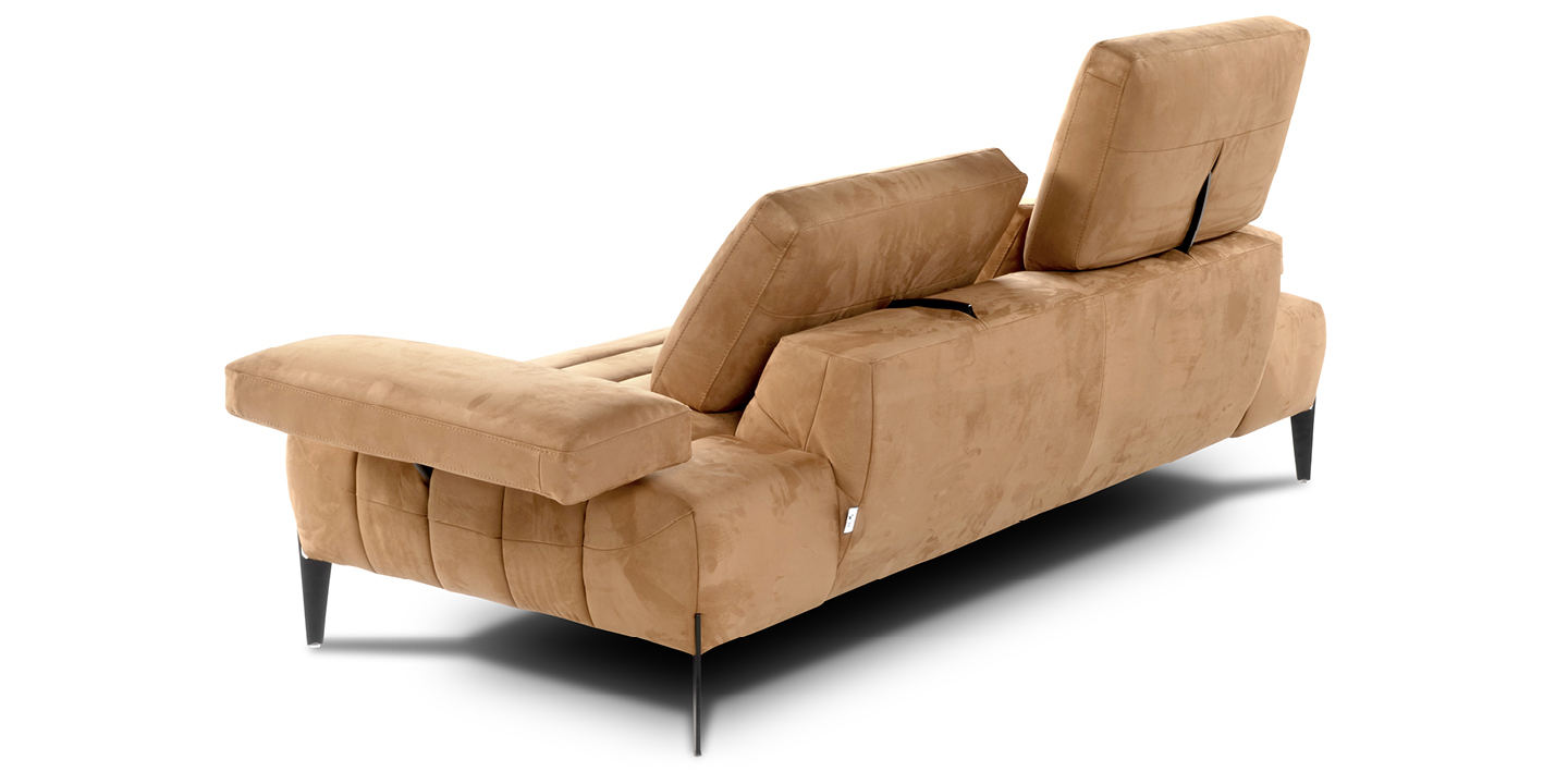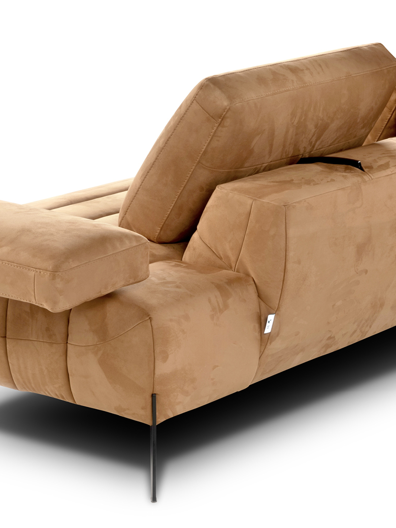 Les accoudoirs sont ajustables, inclinables manuellement et déplaçables vers l’extérieur, tout comme les dossiers, qui peuvent être relevés manuellement grâce à un mécanisme basculant en finition titane, offrant un soutien ergonomique pour la tête. Grâce au système Zero Wall, les dossiers basculants augmentent la profondeur de l’assise, transformant ainsi le canapé en un véritable day bed, sans modifier son encombrement.