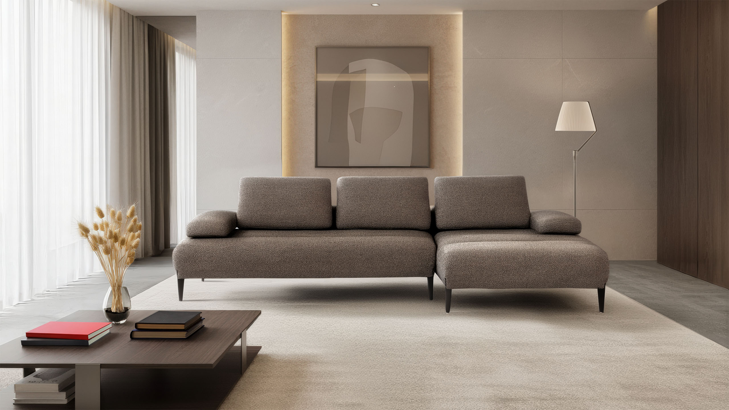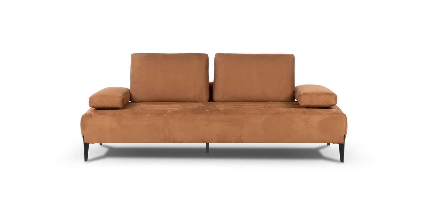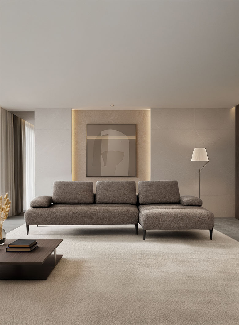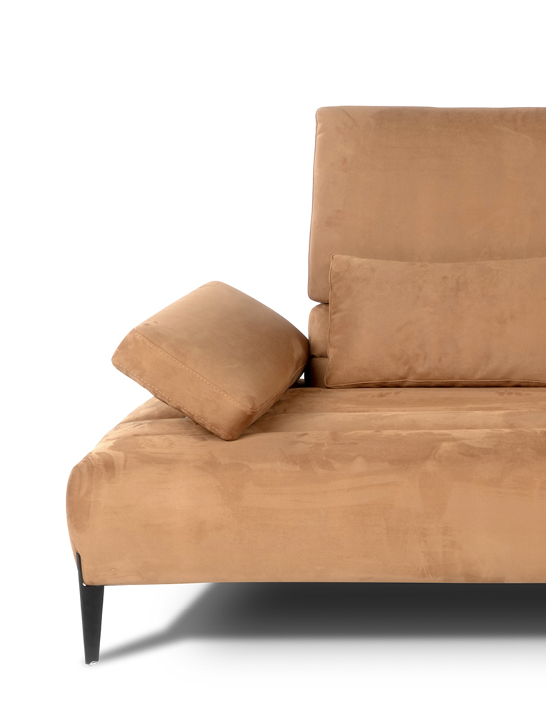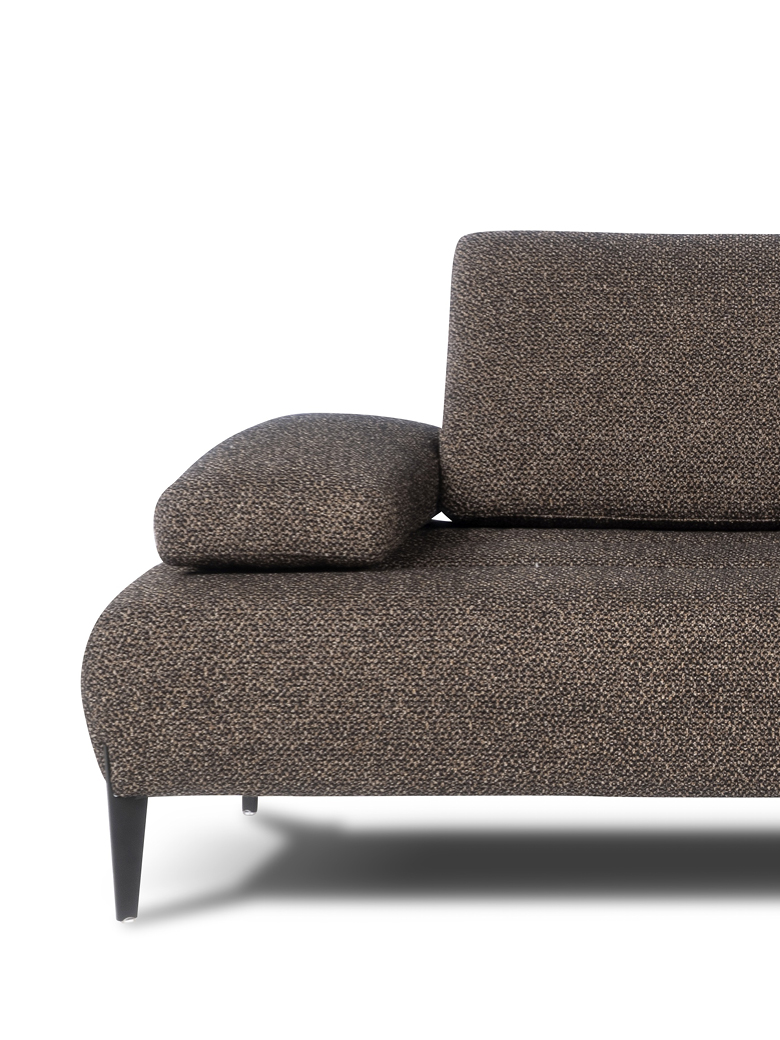 Les accoudoirs sont ajustables, inclinables manuellement et déplaçables vers l’extérieur, tout comme les dossiers, qui peuvent être relevés manuellement grâce à un mécanisme basculant en finition titane, offrant un soutien ergonomique pour la tête. Grâce au système Zero Wall, les dossiers basculants augmentent la profondeur de l’assise, transformant ainsi le canapé en un véritable day bed, sans modifier son encombrement.