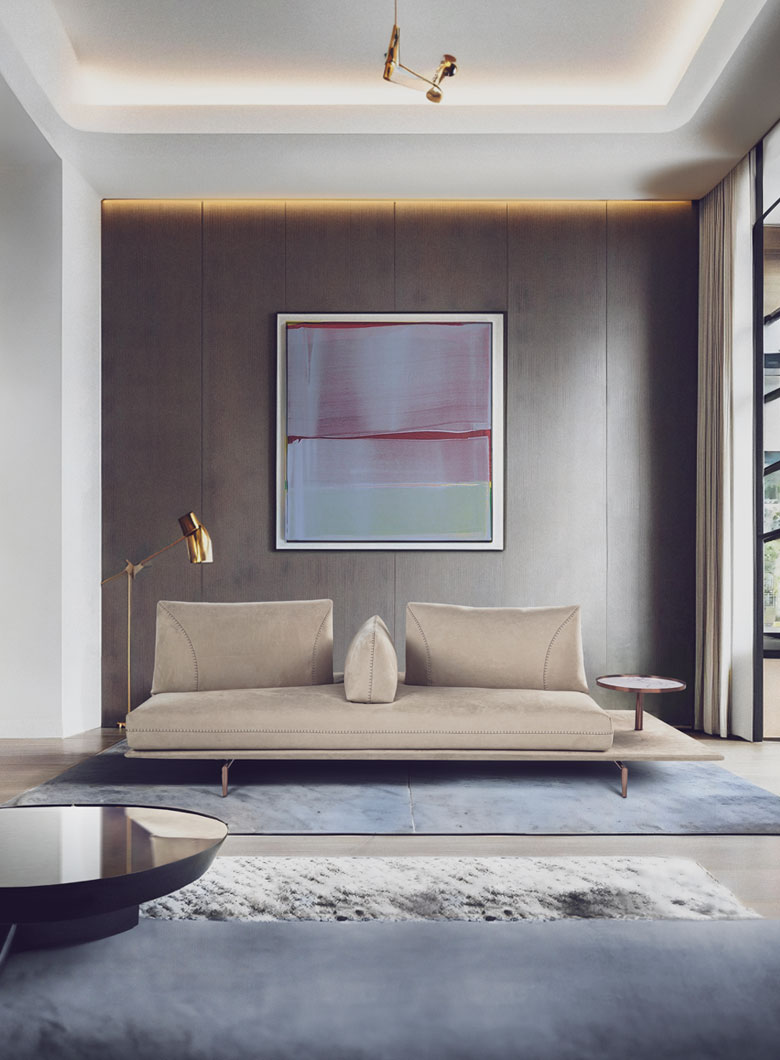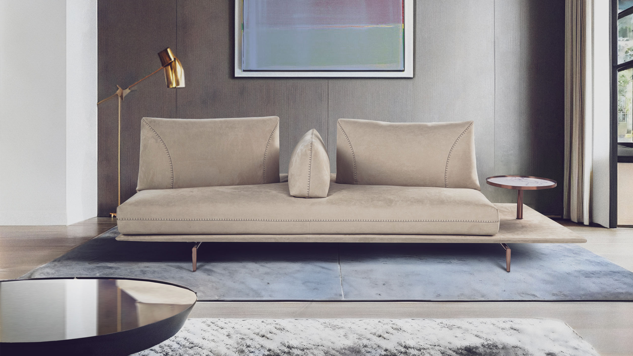 La versatilità è la cifra del divano Gianduiotto. Nasce, infatti, con schienale e bracciolo posizionabili liberamente per consentire molteplici posizioni nella seduta, inclusa quella frontale vis-à-vis o anche la posizione sdraiata. La sua natura aperta e destrutturata lo rende il protagonista ideale al centro dell’ambiente, con una cucitura decorativa sulle spalliere e sul perimetro della seduta che contribuisce a impreziosirne il disegno. Alcune versioni prevedono un prolungamento della base, disponibile come piano di appoggio o corredata di tavolino con le medesime finiture del piede. Il piede in metallo, in finitura rame, solleva il divano da terra e diventa un elegante elemento decorativo.