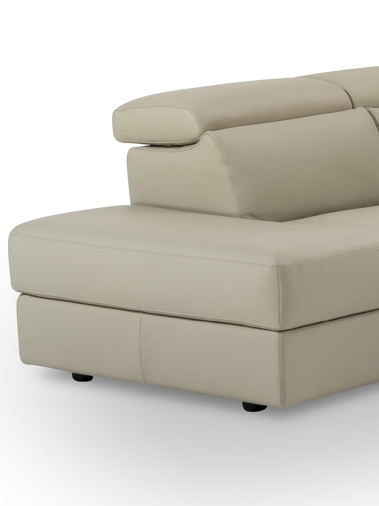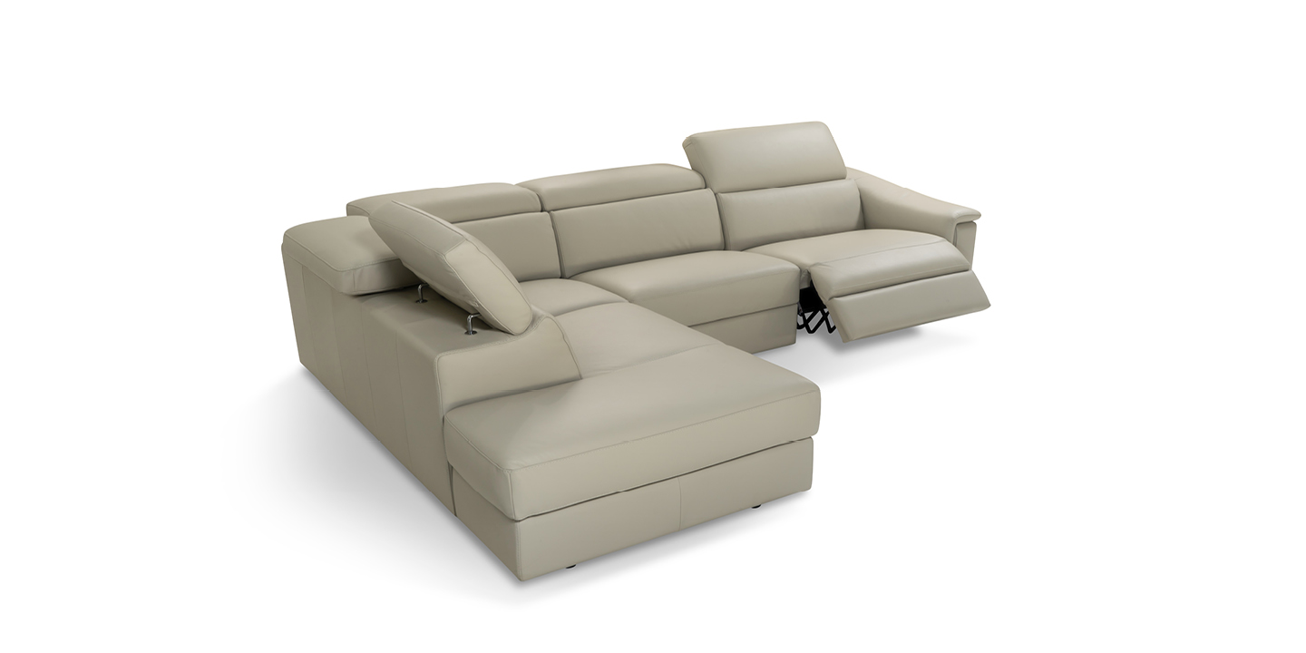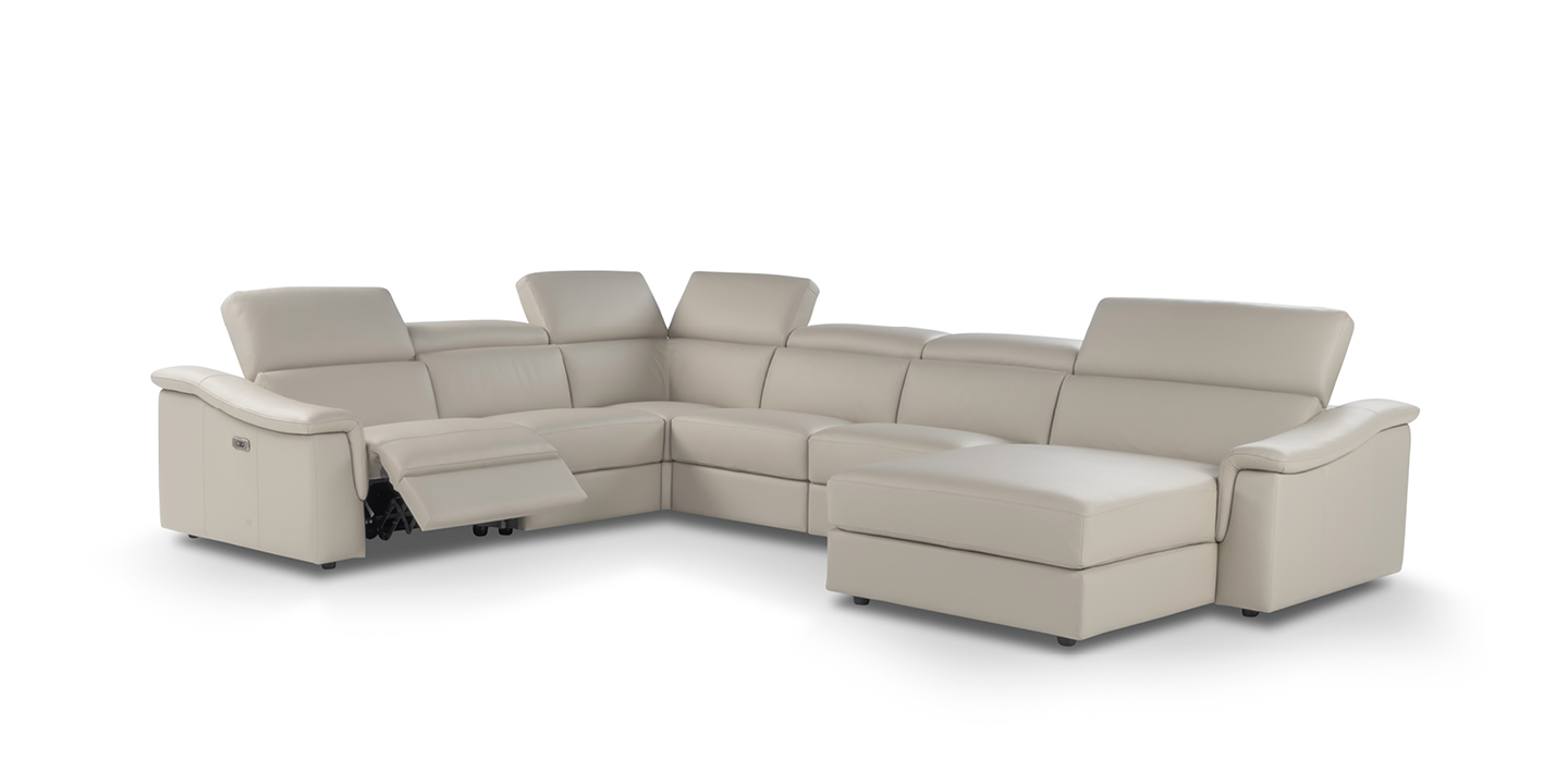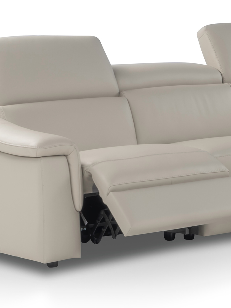 Its elongated proportions and clean lines make it a perfect fit for both modern and more traditional spaces. The recliner versions come equipped with a motorized mechanism, activated via a button panel on the armrest side or a touch control on the armless side, with an added USB port for convenience.
