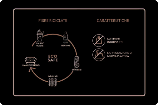 Questi rivestimenti sono realizzati con filati riciclati provenienti da rifiuti plastici e bottiglie PET, altrimenti destinati alla discarica, che vengono rigenerati in un’ottica di economia circolare dando vita ad un sofisticato filato di nuova generazione. Nel filato non sono presenti sostanze tossiche per l’uomo e le fasi di lavorazione non scaricano nelle falde acquifere sostanze tossiche. Non contengono PFAS e sono inoltre lavabili, smacchiabili, antibatterici, traspiranti, antimuffa, resistenti ai raggi UV e imputrescibili.