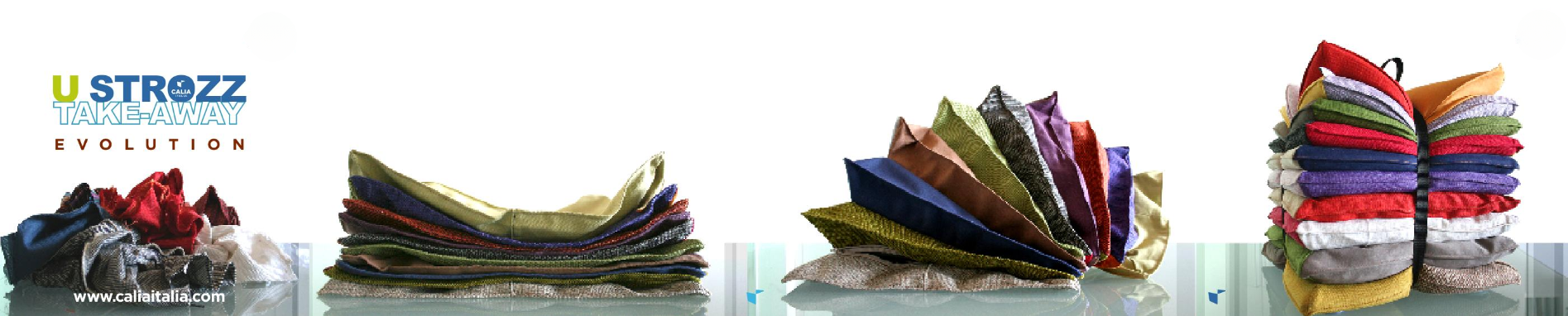 Tra i prodotti realizzati con gli scarti il più iconico è sicuramente il pouf U’Strozz. In dialetto materano gli stracci, è il pouf ecosostenibile composto da numerosi strati di pelle o tessuto colorati, ottenuti da scarti di produzione, tenuti insieme da un book stool.
